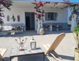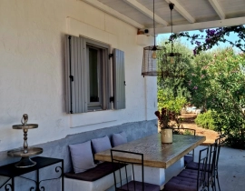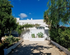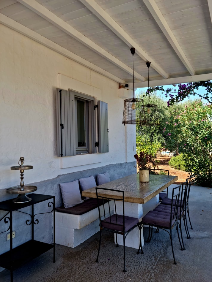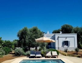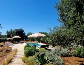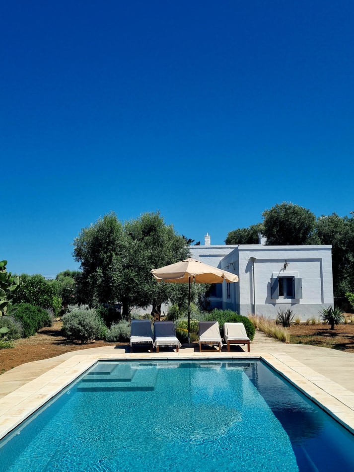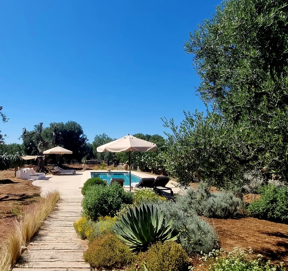 Trotz einer gewissen Einfachheit haben die 3 Schlafzimmer und Bäder sowie der Wohnbereich und die Küche auf insgesamt 140 Quadratmetern ein sehr elegantes Flair. Die Farbpalette ist weich und beruhigend: graue, weiße und sandige Töne dominieren das Bild. Im Garten wird der Pool von einer beeindruckenden indischen Feige auf der einen Seite und dem jahrhundertealten Olivenhain auf der anderen Seite geschützt. Hier sind die Farben kräftig: die Gruntöne der Pflanzen, das tiefe Blau des Pools und das dunkle Rot der apulischen Erde.