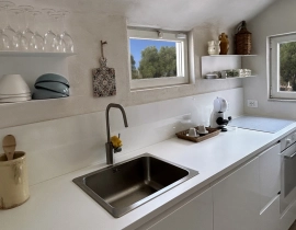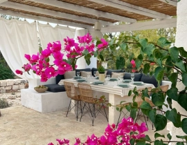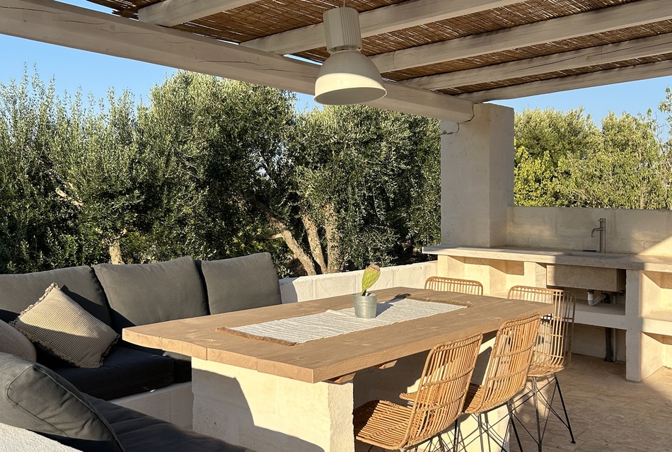 Der Bereich unter der Pergola ist mit einem großen Esstisch und einer Außenküche ausgestattet, sodass Mahlzeiten im Freien zu einem genussvollen Bestandteil Ihres Aufenthalts werden. Spazieren Sie durch die umliegende Landschaft und genießen Sie die Düfte der mediterranen Vegetation im Schatten der Oliven- und Obstbäume.