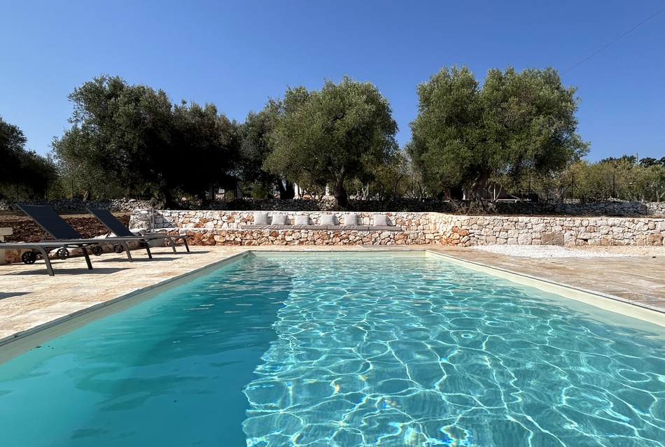 Treten Sie hinaus und tauchen Sie ein in die apulische Sonne und Landschaft – genießen Sie ein erfrischendes Bad im privaten Pool, der perfekte Ort, um sich an heißen Tagen abzukühlen.